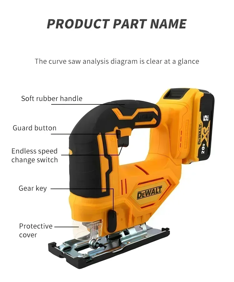 This electric screwdriver is more than just a jig saw; it's a versatile power tool that can tackle a range of tasks. Whether you're a professional woodworker or a DIY enthusiast, the Dewalt Brushless Curve Saw is designed to meet your needs. The machine switch is easy to operate, and the maximum stroke of the saw iron ensures that you can make precise cuts through a variety of materials. The lightweight and portable design make it easy to carry to any work site, ensuring that you have the right tool for the job, whenever and wherever you need it.