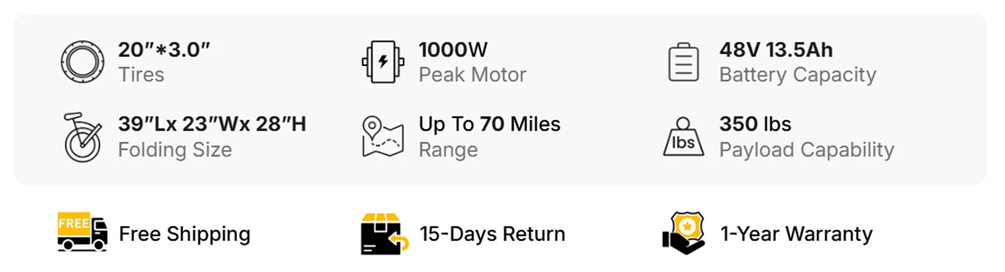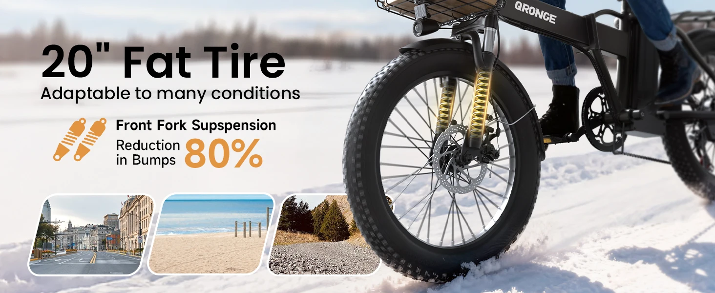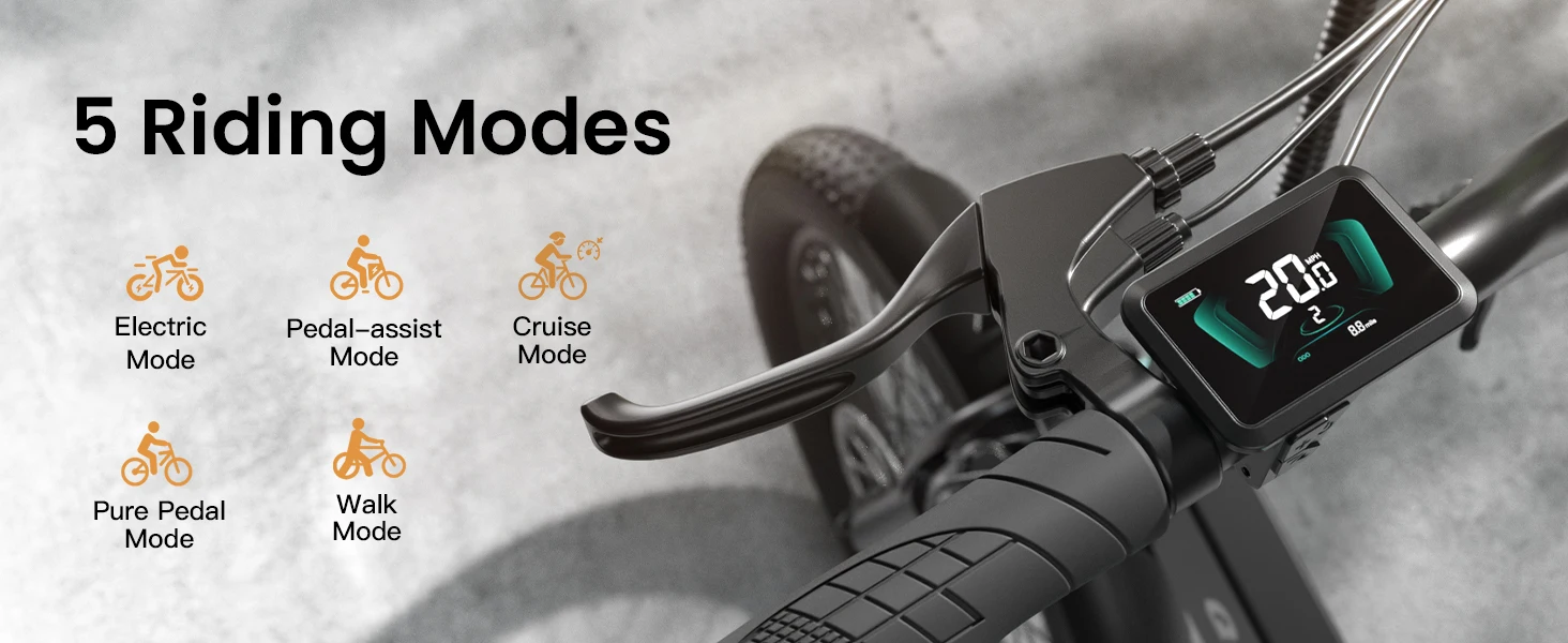 【Comfortable Riding Experience】Equipped with 20”x 3.0” fat tires and 7-speed Shimano derailleurs, 5 Riding Modes for you to switch between, features hydraulic front forks, the bike allows you to ride on all terrains. In addition, features disc brakes and rear lights to enhance your riding safety.