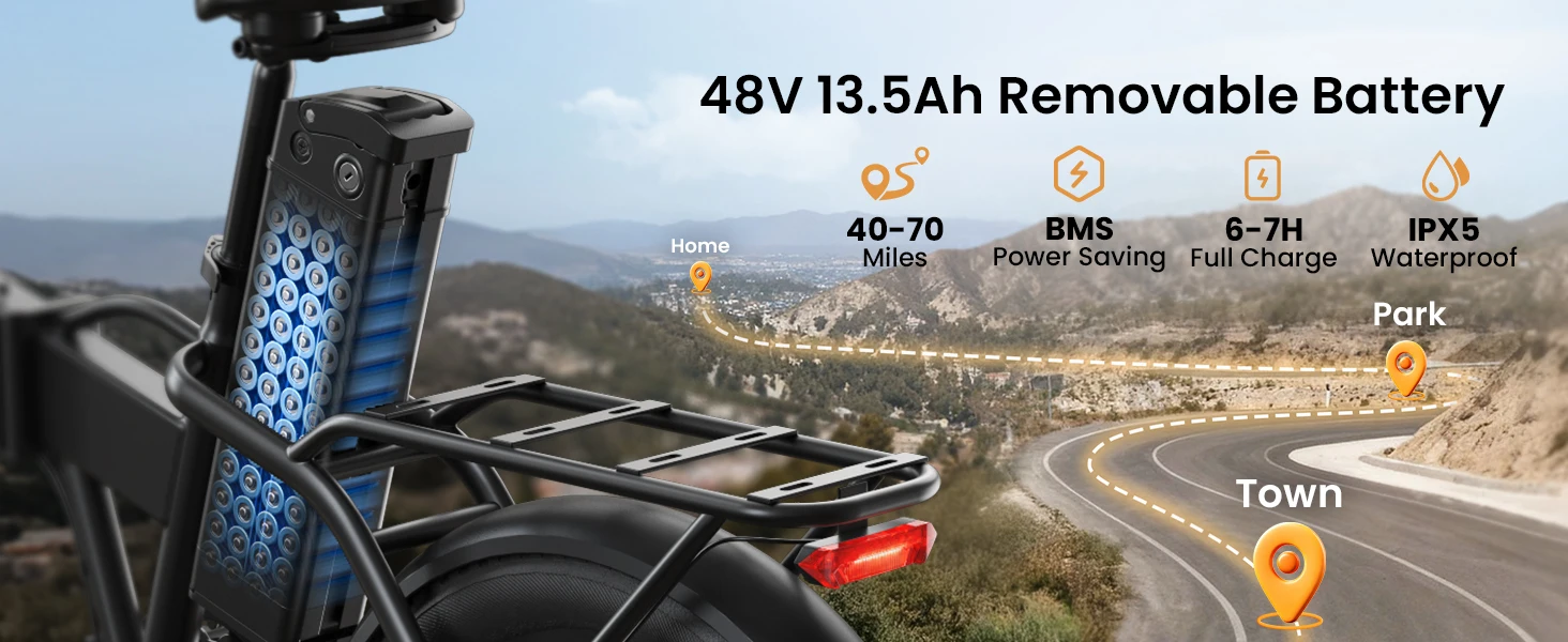 【48V 13.5AH Generous Range Battery】Equipped with a removable 48V 13.5AH battery. Fully charges in just 6-7 hours, providing a riding range of 40-70 miles (actual range varies based on usage conditions). Features an IPX5 waterproof battery design for enhanced riding safety.